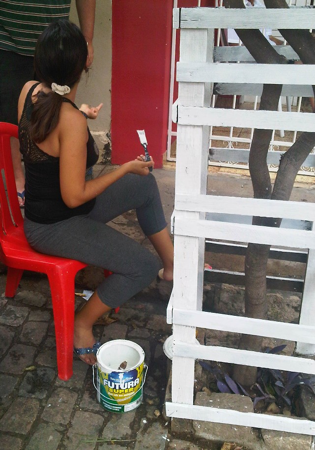 Eu no frisson de emperequetar tudo, pedi ao cunhado das carnes (risos) que arrumasse tinta branca para eu dar um grau no cercadinho do pé de oiti que fica junto à calçada da casa. O povo passava e comentava: "Ela não se aquieta, o que tá inventando agora?" Outro detalhe: eu estava bebericando uma cervejinha, copo na mão, pincel na outra, aí o repertório mudava: "Você vai acabar mergulhando o pincel na cerveja e bebendo a tinta!" Eu posso com esse povo fuleiragem?